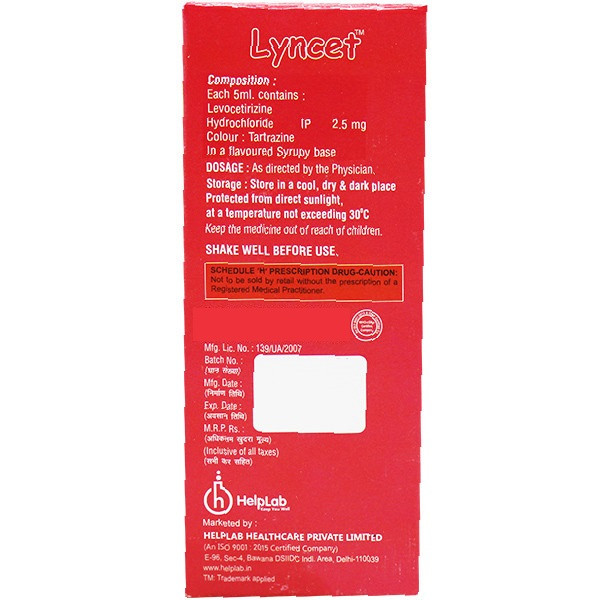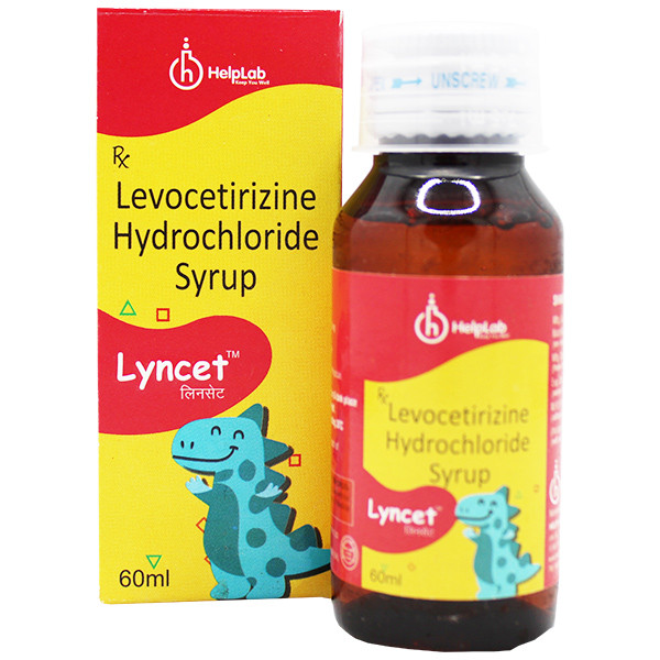 The medication LYNCET SYRUP 60ML from Helplab is an antihistamine. It is employed in the treatment of a number of allergic diseases, including hay fever, conjunctivitis, and some skin reactions like eczema, hives, and reactions to stings and bites. It stops itching, sneezing, runny nose, and watery eyes.