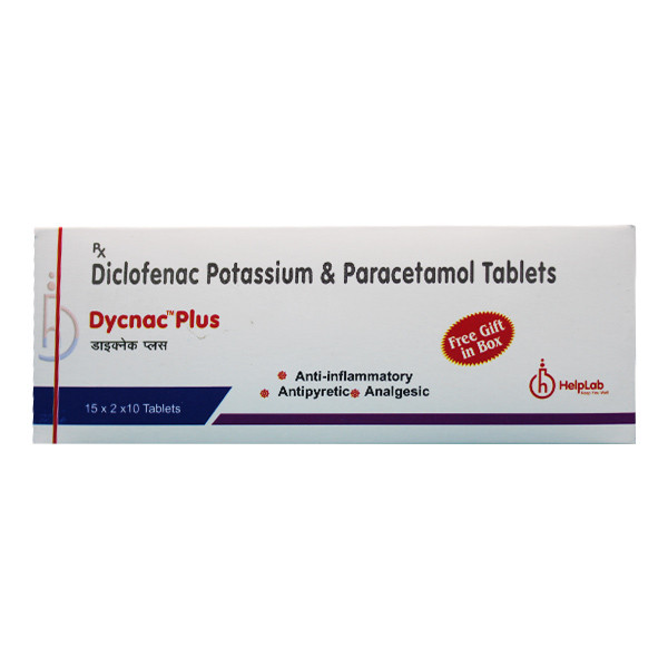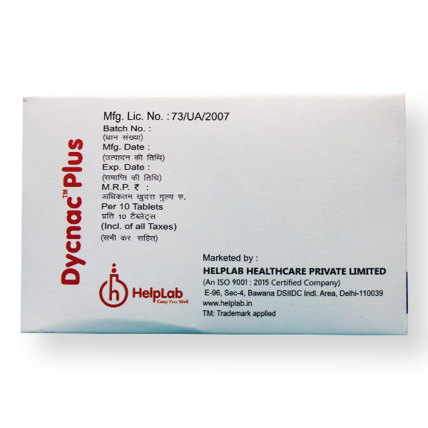 DYCNAC PLUS TABLET from Helplab should be taken with food. This will keep your stomach from becoming upset. You should take it regularly, as directed by your doctor. Take no more or use it longer than your doctor has prescribed. Inform your doctor about all other medications you are taking to ensure its safety. Before using this medication, pregnant or breastfeeding women should consult their doctors. Before taking it, tell your doctor if you have any heart, kidney, or liver problems or if you have stomach ulcers.